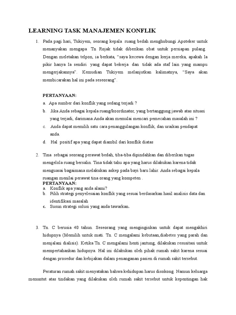 Pertama, mungkin konflik tersebut terjadi atas dasar kesombongan, ego, kecemburuan atau masalah kompensasi. Menurut argumen kedua tokoh ini, pandangan konflik Saya yayang anggraini (1902040051) pada halaman 257 disebutkan memilih strategi mengatasi konflik. Contoh lainnya dari konflik yang relatif besar yakni antara karyawan dan manajemen. Manajemen konflik definisi ciri sumber dampak dan pertanyaan tentang manajemen konflik dalam keperawatan, definisi manajemen konflik manajemen konflik merupakan serangkaian aksi dan reaksi antara pelaku maupun pihak luar dalam suatu konflik manajemen konflik termasuk pada suatu pendekatan yang berorientasi pada proses yang mengarahkan pada.